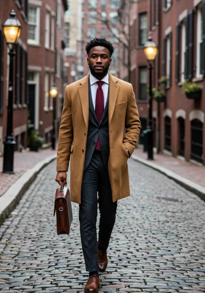 Here we have a camel overcoat layered over a sleek charcoal suit, paired with a white dress shirt and a textured red tie. The structured tailoring, polished leather shoes, and brown briefcase make this outfit perfect for city streets with history and charm.