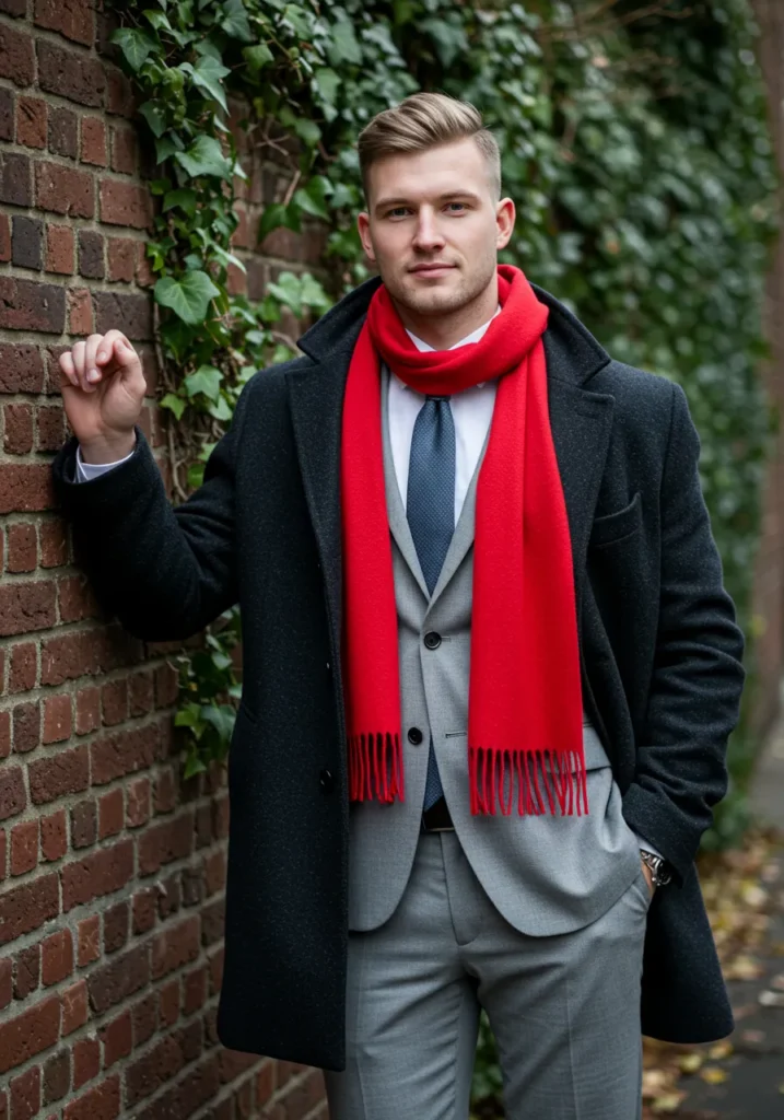 This look layers a tailored light gray suit with a deep navy tie, styled under a charcoal overcoat. The standout piece is the vivid red scarf that brings energy and warmth to the entire ensemble. His pose against the ivy-covered brick wall adds character.