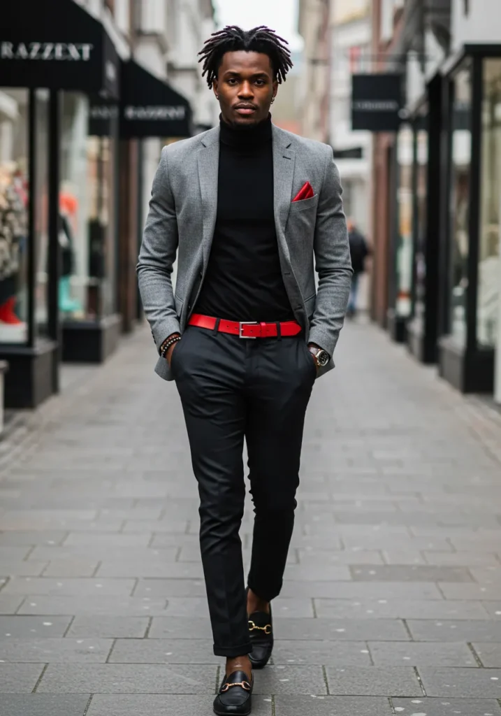 This look mixes a gray blazer with a black turtleneck and slim black trousers. The bold red belt and matching red pocket square are what catch the eye, perfectly balanced by black loafers and sleek accessories.