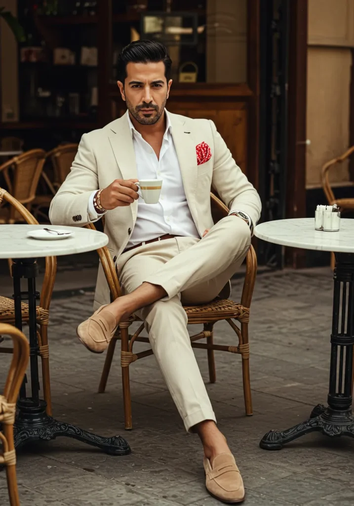 This relaxed outfit features a beige suit styled with a white open-collar shirt and a patterned red pocket square. Tan loafers keep it laid-back, while the setting of a Parisian café adds to the effortless charm.