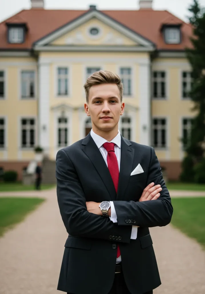This outfit is the definition of timeless. A perfectly tailored black suit is paired with a crisp white shirt, a bold red tie, and a sharp white pocket square. The polished silver watch adds just the right finishing touch, while the grand estate in the background makes the look feel even more refined.