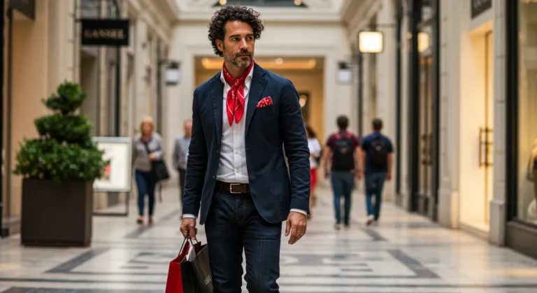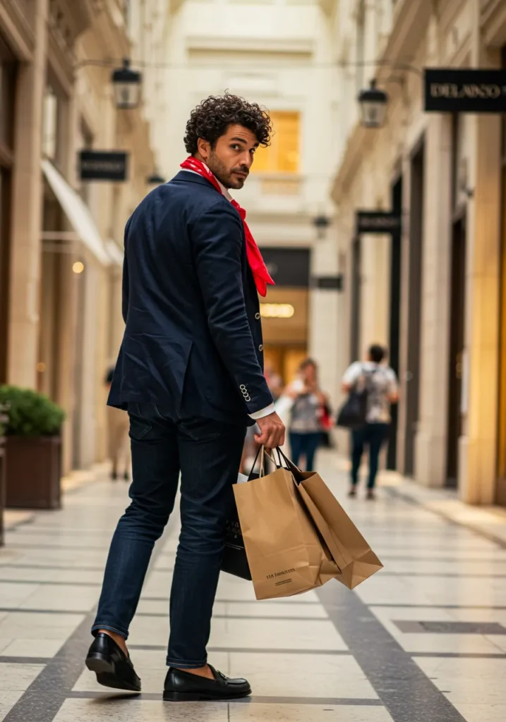 Here’s a smart-casual look with flair. A navy blazer is paired with dark jeans and classic loafers, while the striking red scarf around his neck gives the outfit energy and character. The shopping bags add a lifestyle touch, making the whole scene feel stylishly candid.