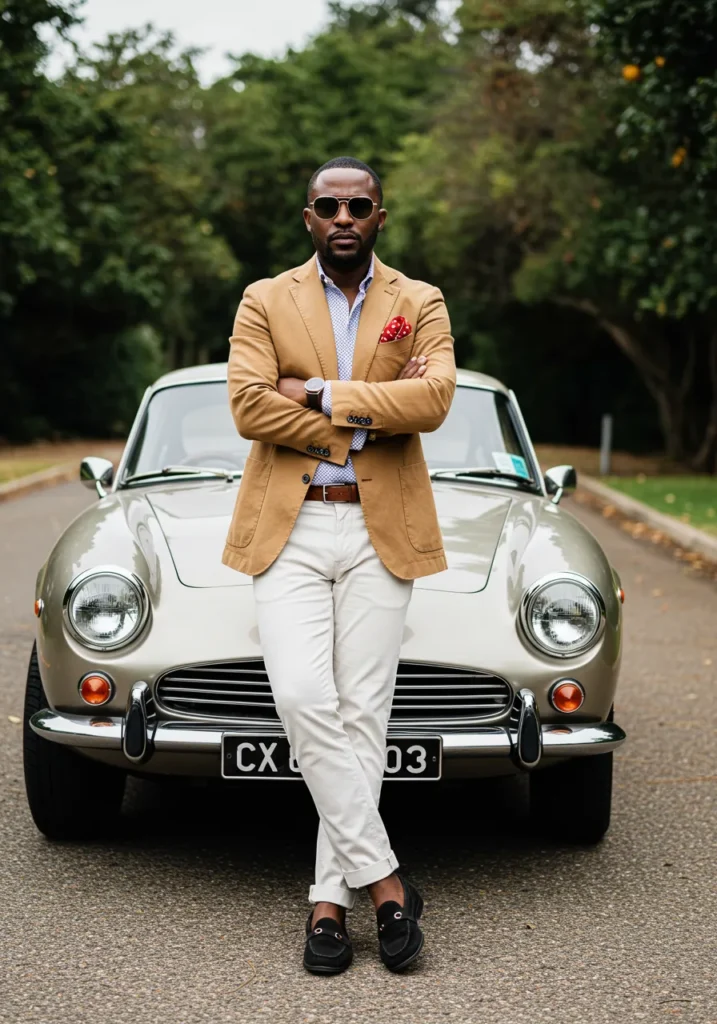 This ensemble features a camel blazer layered over a patterned shirt, paired with ivory trousers and black loafers. A red pocket square provides that pop of richness, while aviator sunglasses and a vintage car in the background give it cinematic charm.