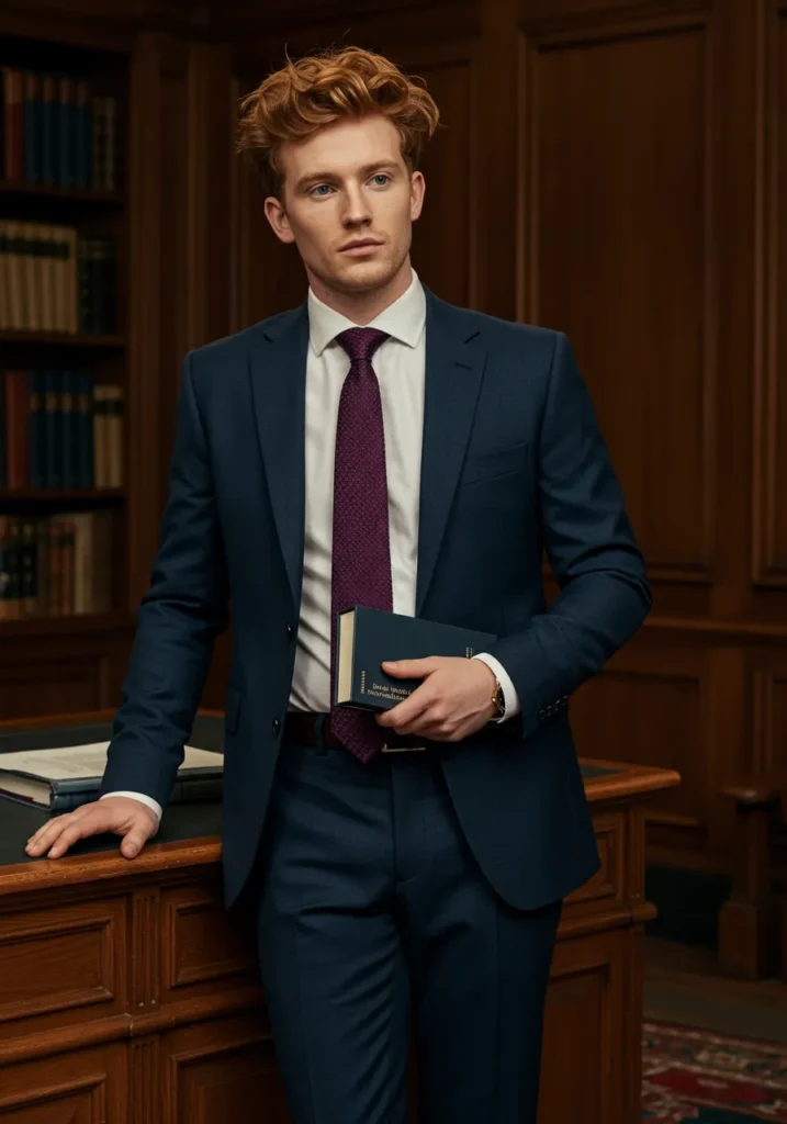 This look keeps it sleek with a tailored navy suit and a crisp white shirt, finished off with a textured tie in a deep red shade. The setting in a wood-paneled library adds an extra touch of gravitas, balancing intellect with style.