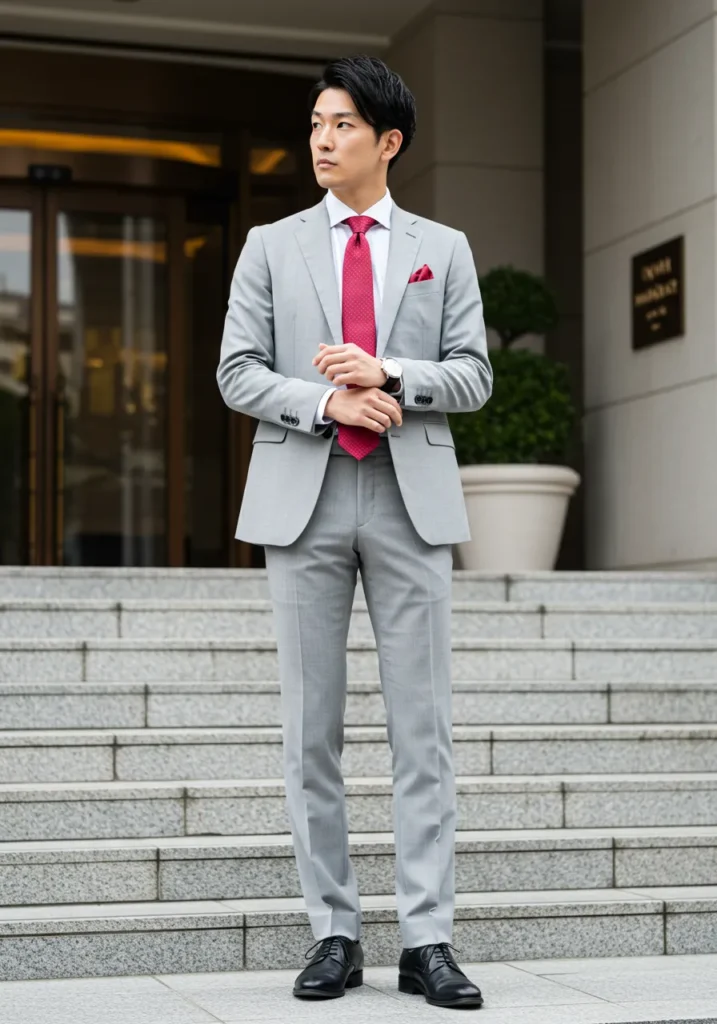 Here’s a crisp modern outfit: a slim gray suit paired with a white shirt, finished with a bold red tie and pocket square. Black dress shoes keep it grounded, while the clean city staircase backdrop enhances the sharp vibe.