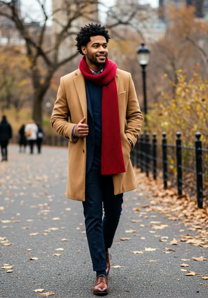 This look layers a camel overcoat over a navy suit, paired with polished brown shoes. The standout is the deep red scarf, which ties everything together and gives the outfit a cozy yet luxurious feel. The park setting adds charm and elegance.
