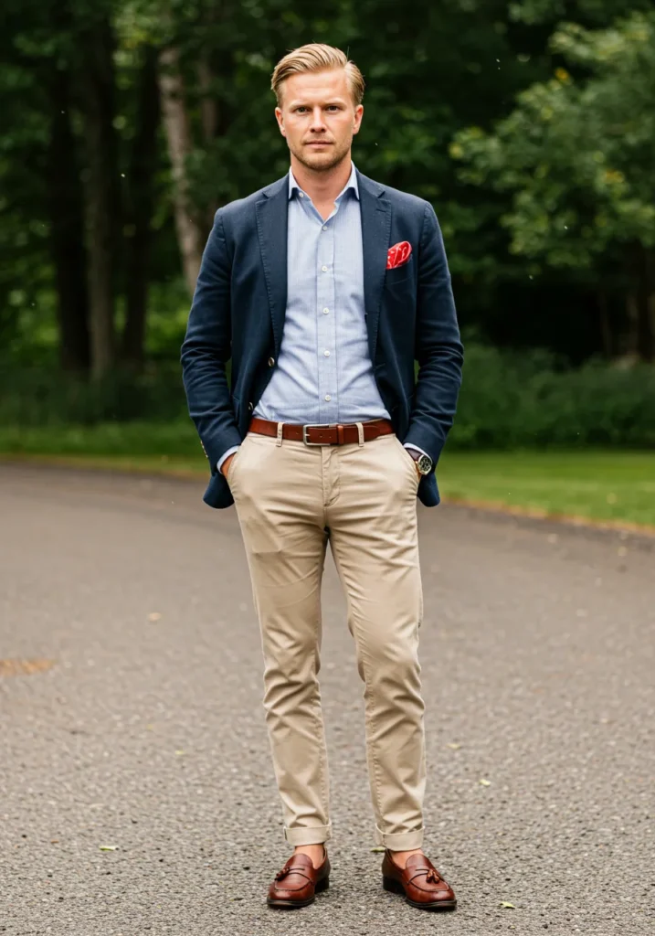 This look blends casual and refined elements with ease. A navy blazer sits perfectly over a light blue shirt, styled with beige chinos and polished brown loafers. The red pocket square adds that subtle spark of personality, pulling the outfit together in a way that feels timeless.