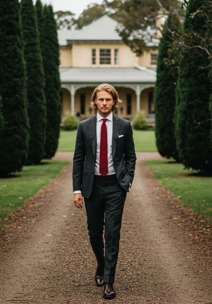 This look is sharp and refined with a tailored charcoal suit paired with a crisp white shirt. The standout piece is the deep burgundy tie, perfectly complemented by dark leather shoes and a neatly folded white pocket square. The stately home and manicured path in the background give it an old money edge.