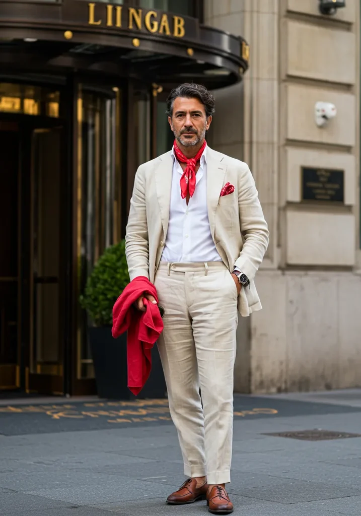 Similar in style but slightly different in execution, this look features a light cream suit paired with a red scarf at the collar and a red pocket square tucked neatly in. Brown leather shoes ground the outfit, while the fitted tailoring keeps it looking sharp.