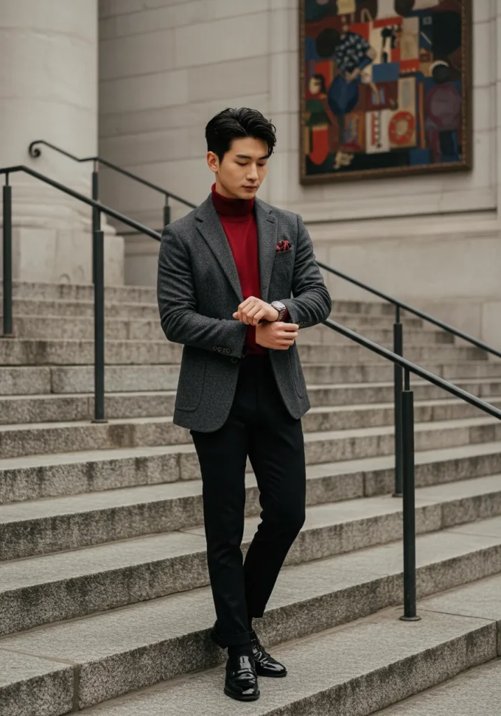 This ensemble combines a tailored charcoal blazer with sleek black trousers and polished black shoes. Underneath, a red turtleneck sweater adds a vibrant pop of color, matched by a red pocket square. The man is posed on stone steps, giving the outfit an architectural elegance.