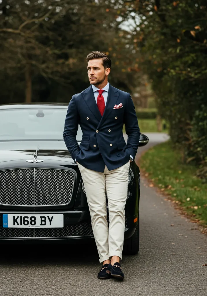 This look pairs a navy double-breasted blazer with beige trousers and black loafers. A red tie and red pocket square give just the right pop of color, while the fit and fabric scream quality. Standing in front of a sleek black car, the styling leans into luxury.