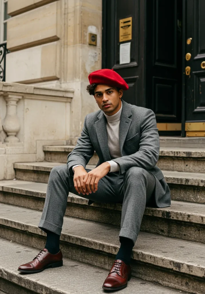 Here we have a gray tailored suit styled with a soft cream turtleneck and polished brown shoes. The red beret steals the show, adding a playful French twist that makes the whole outfit unforgettable. The relaxed seated pose on stone steps makes it casual yet chic.