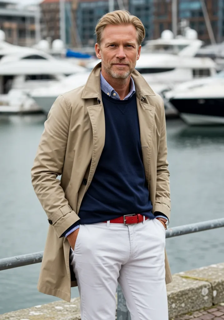 This look pairs a beige trench coat with a navy sweater layered over a checkered shirt, finished off with crisp white trousers. The standout piece is the bold red belt, giving just the right amount of color against the otherwise neutral palette. The setting by the marina adds that relaxed, luxurious touch that feels very old money.