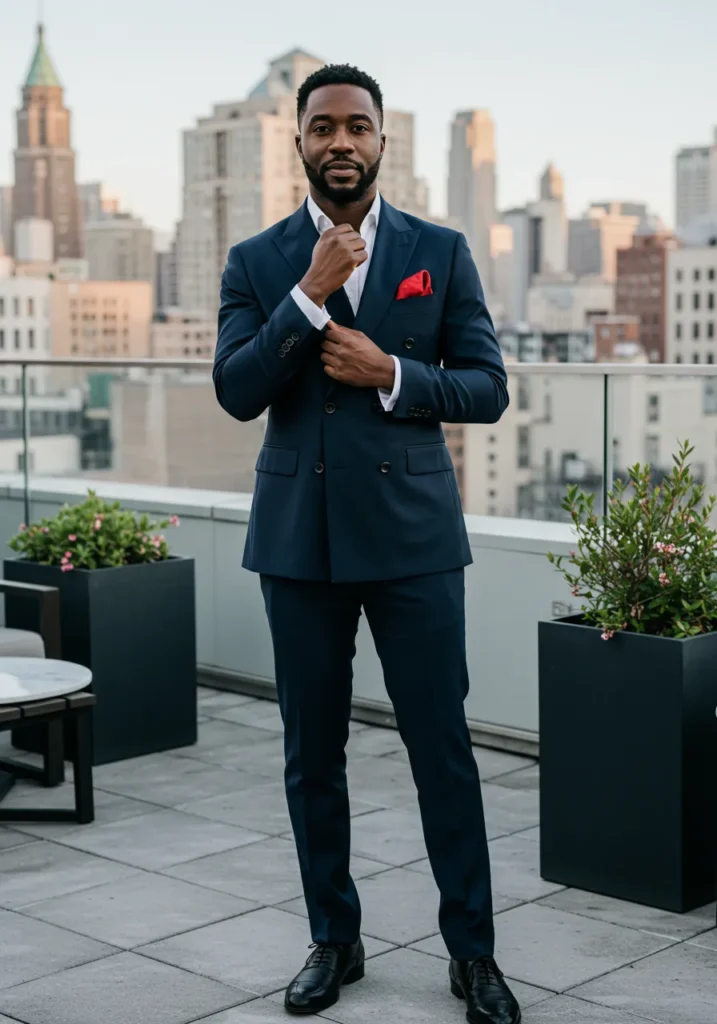 This look features a double-breasted navy suit styled with a white open-collar shirt and a vibrant red pocket square. The sleek black shoes tie everything together, while the modern rooftop setting gives it a fresh, city-slick vibe.