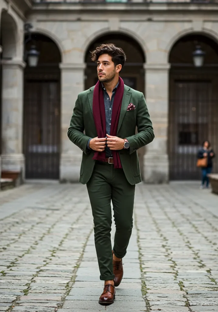 Here we see a man in a tailored forest-green suit, paired with a dark shirt and finished with a burgundy red scarf draped effortlessly around his neck. A red patterned pocket square adds depth, while brown leather shoes ground the look.