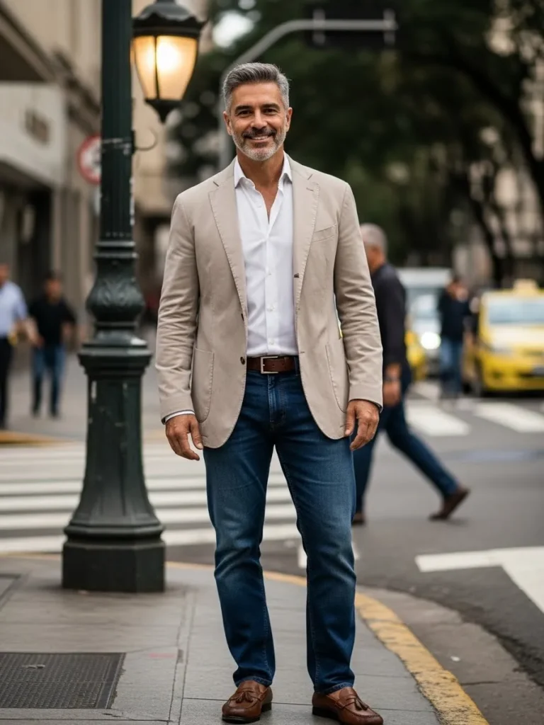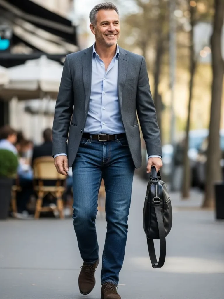 The mix of tailoring and denim keeps the outfit relaxed yet refined.