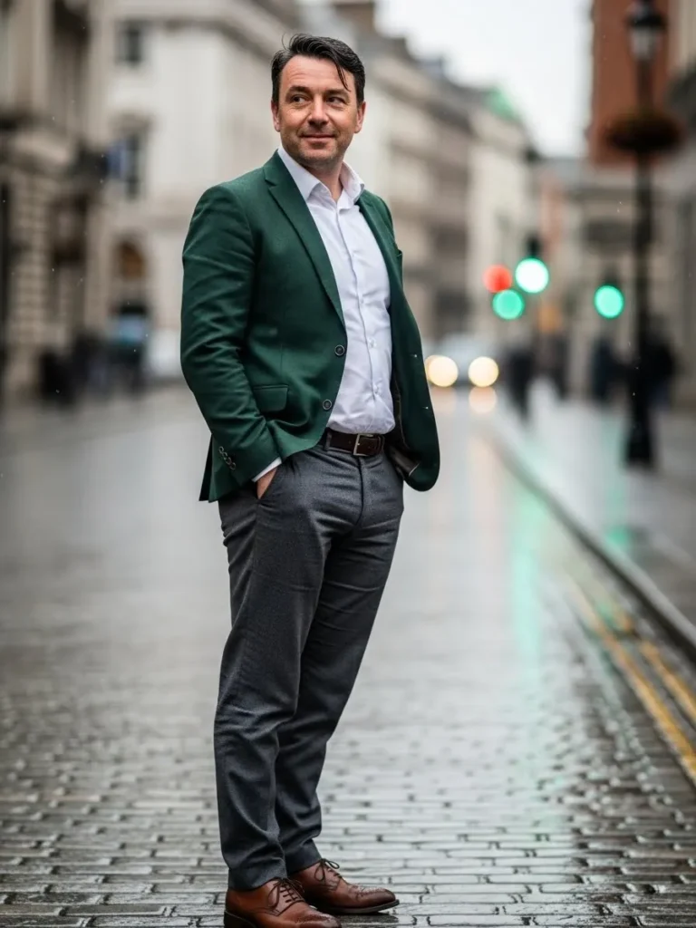A deep green blazer stands out here, paired with a crisp white shirt and dark gray trousers with gentle creases.