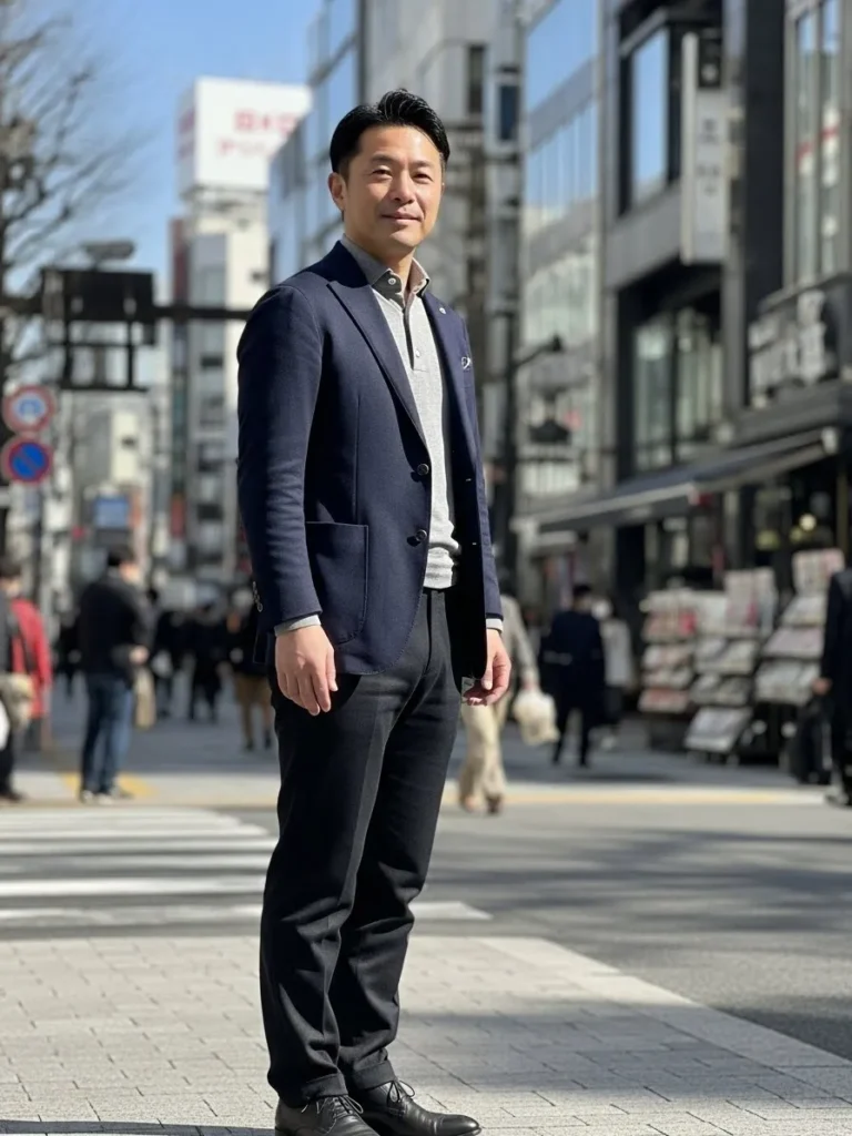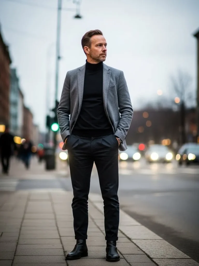 Here we have a charcoal blazer layered over a soft knit top, paired with dark trousers that show natural folds from movement.