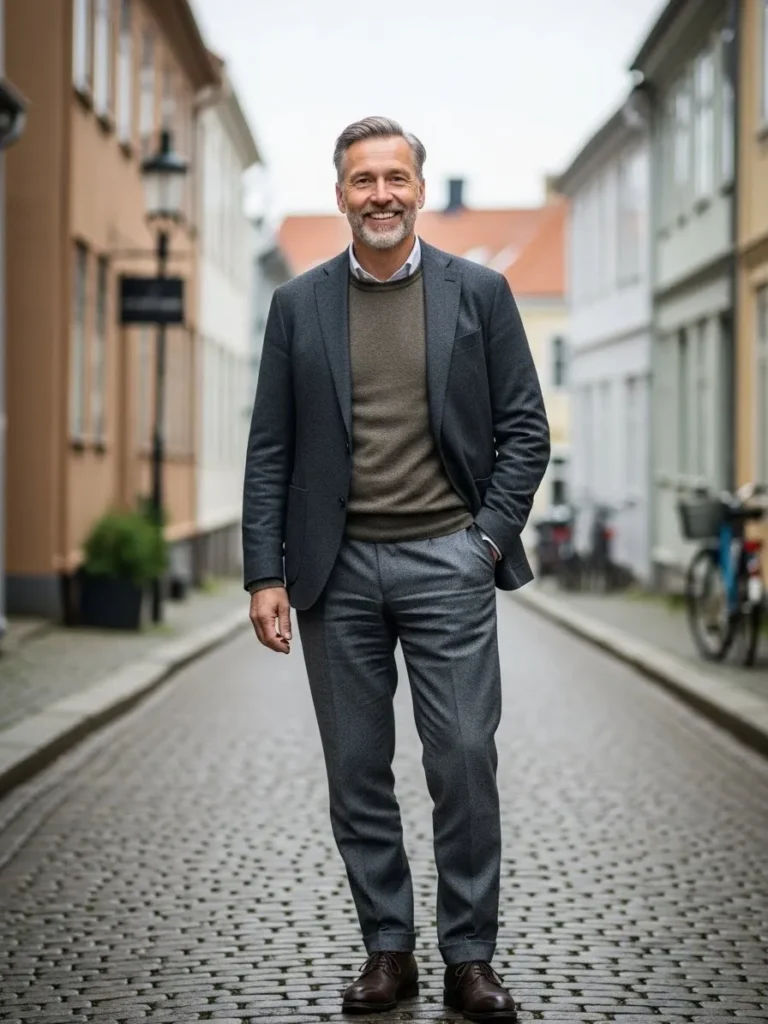 This outfit uses a gray blazer layered over a darker knit top and matching trousers with natural fabric drape.