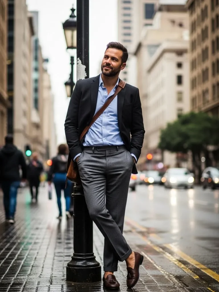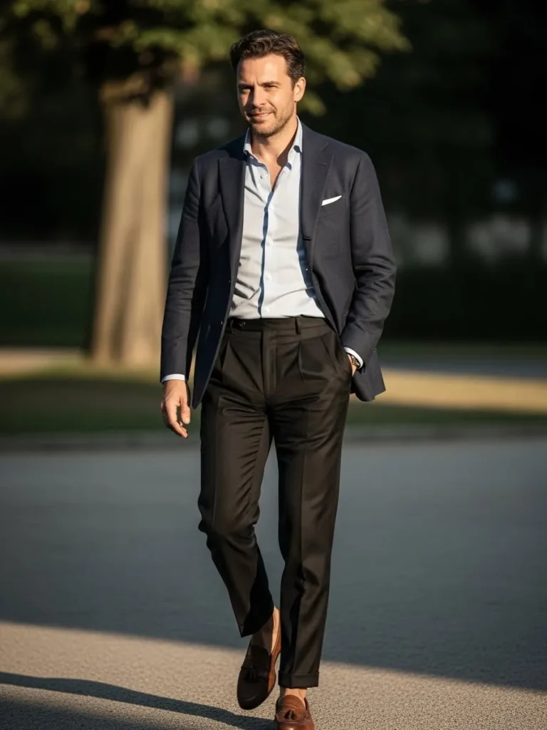 A dark blazer is styled with a light shirt and dark trousers that fall cleanly with slight creases.