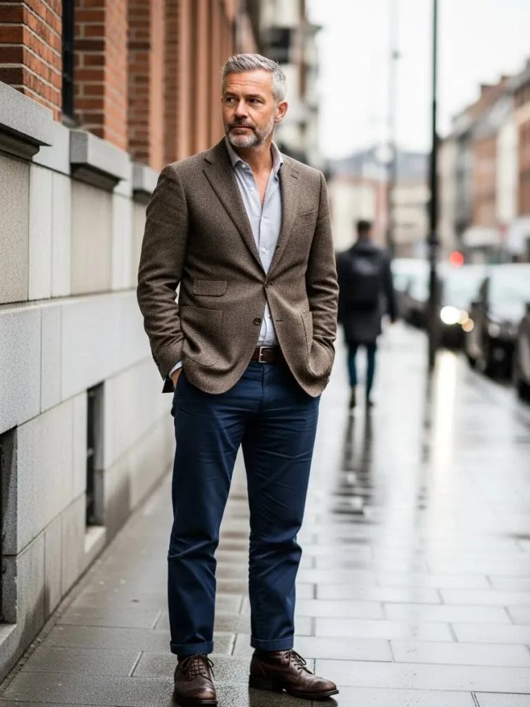 Here we see a brown textured blazer layered over a neutral top, paired with dark blue trousers that show natural movement.