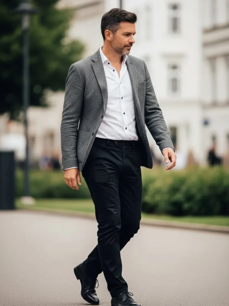 This outfit features a textured gray blazer paired with a clean white button down shirt and slim black trousers with natural movement.