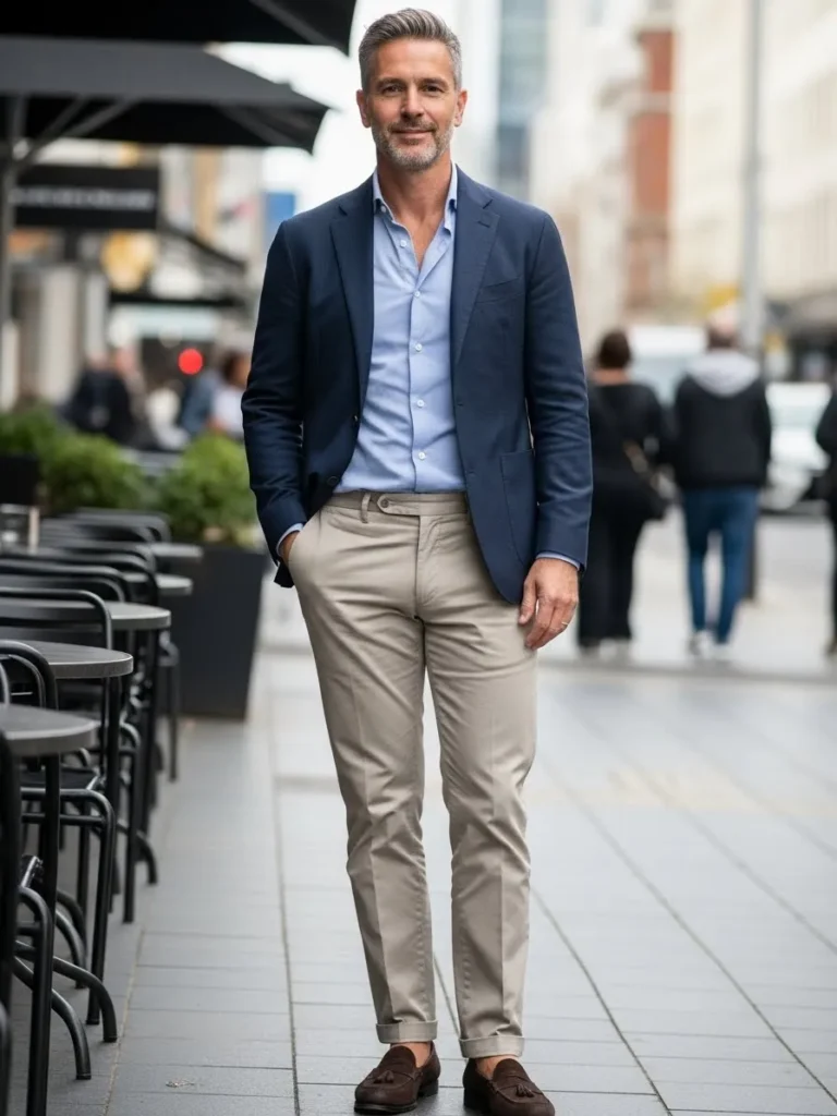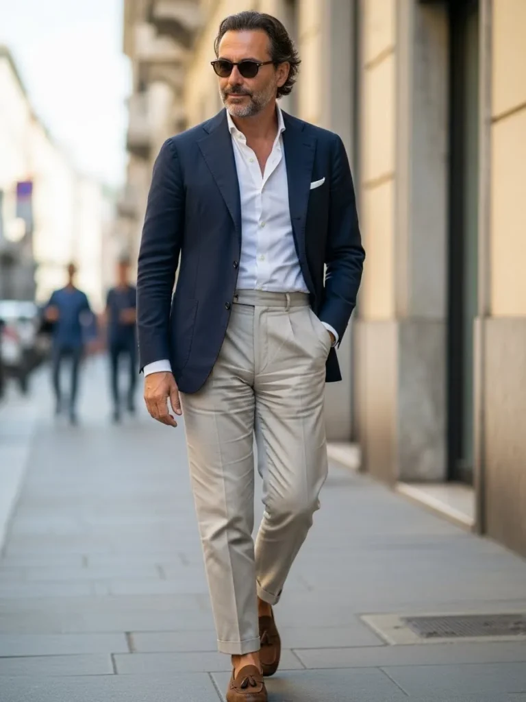 This outfit combines a navy blazer with a light shirt and beige trousers that move easily with each step.