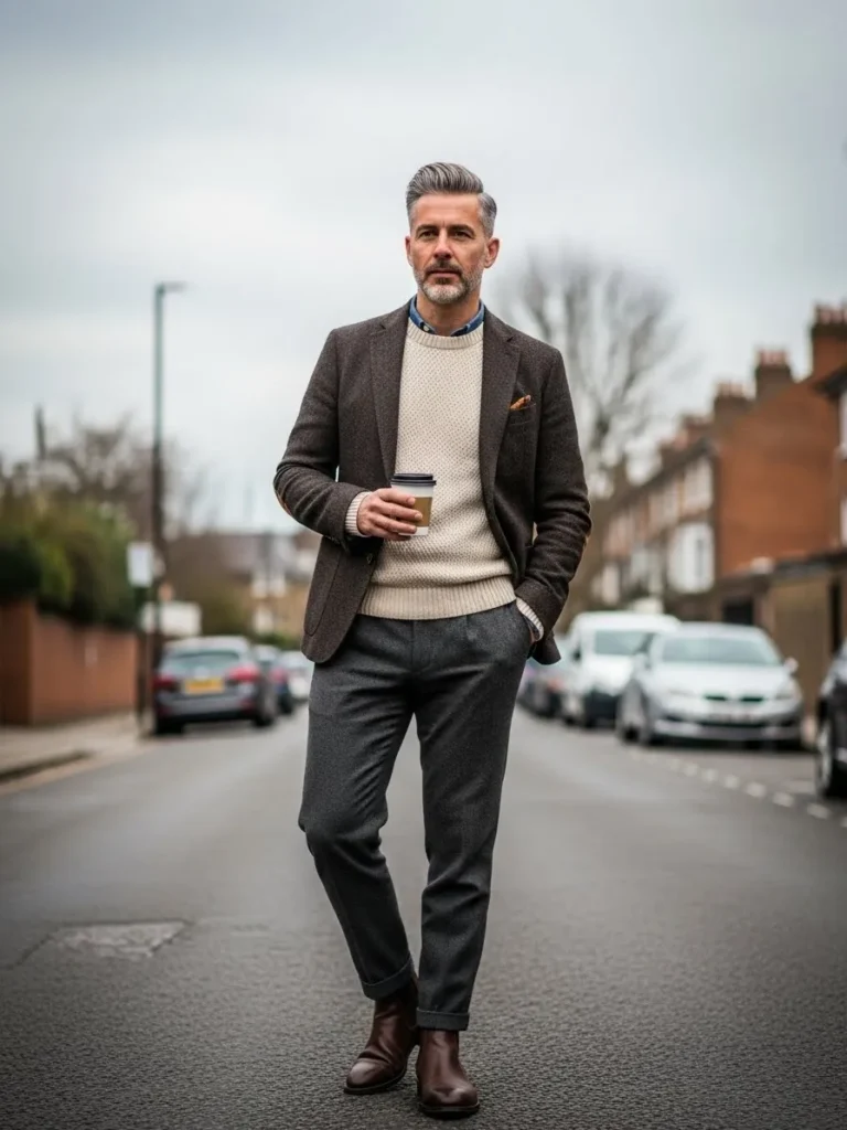 Brown leather shoes add warmth, while the relaxed fit keeps the look semi formal without feeling rigid or overly styled.