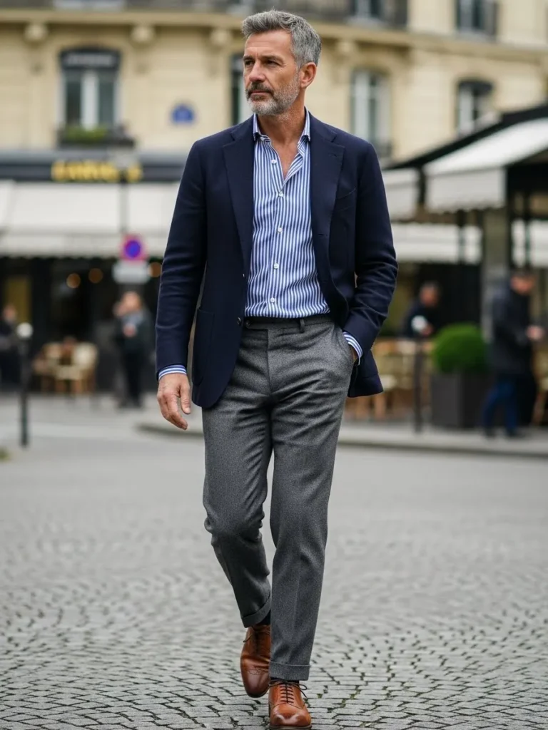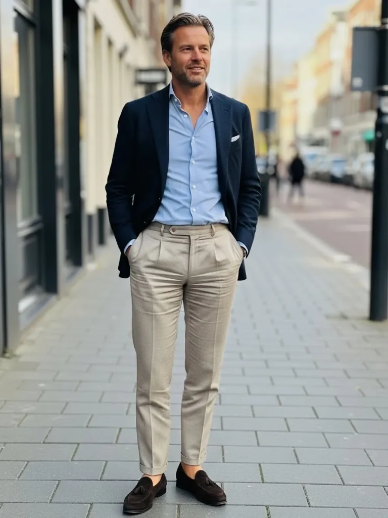 Here we see a navy blazer styled with a light blue shirt and beige tailored trousers that fall softly with natural creases.