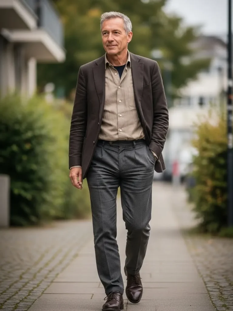 A dark brown blazer is styled with a beige shirt and gray trousers that fall neatly with soft creases.