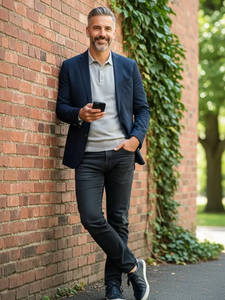 Navy Blazer With Dark Denim Ease