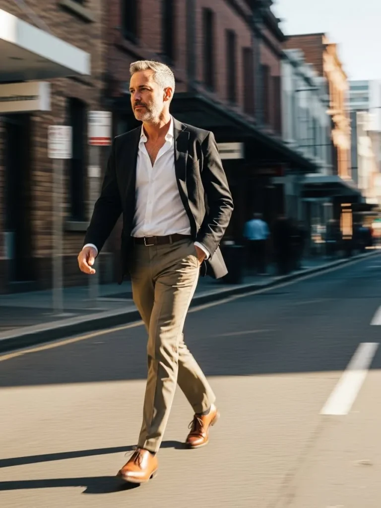 Brown shoes and a confident walking stance complete the semi formal vibe.
