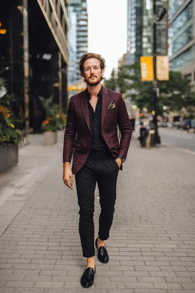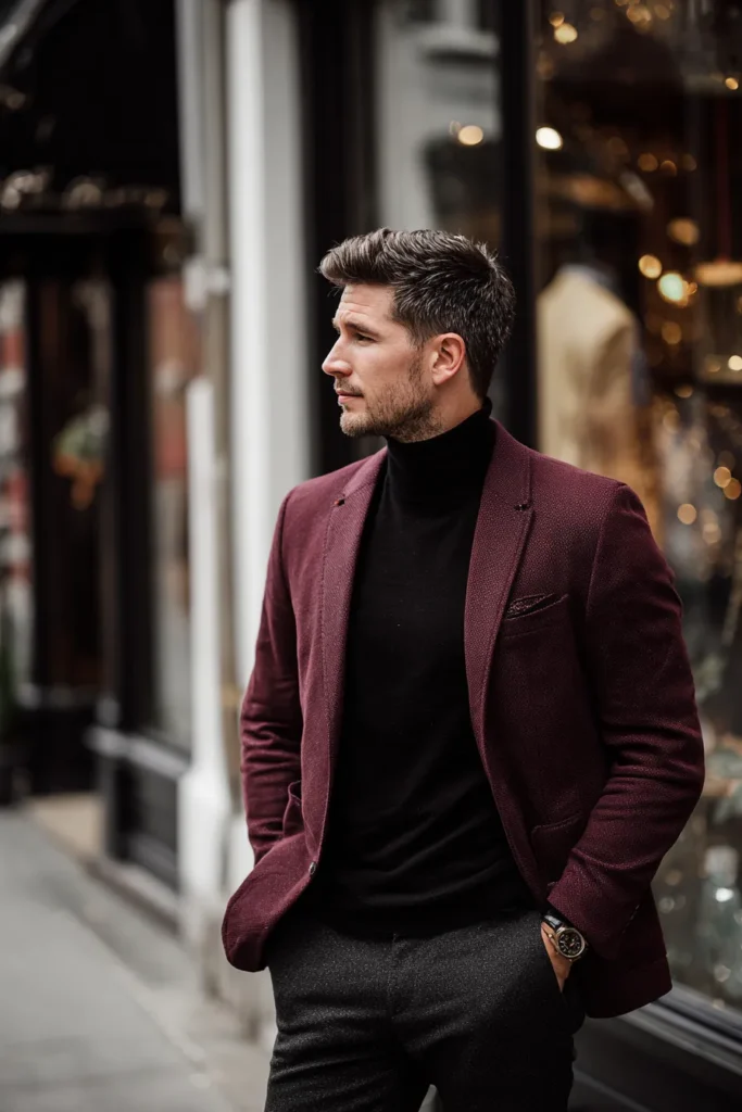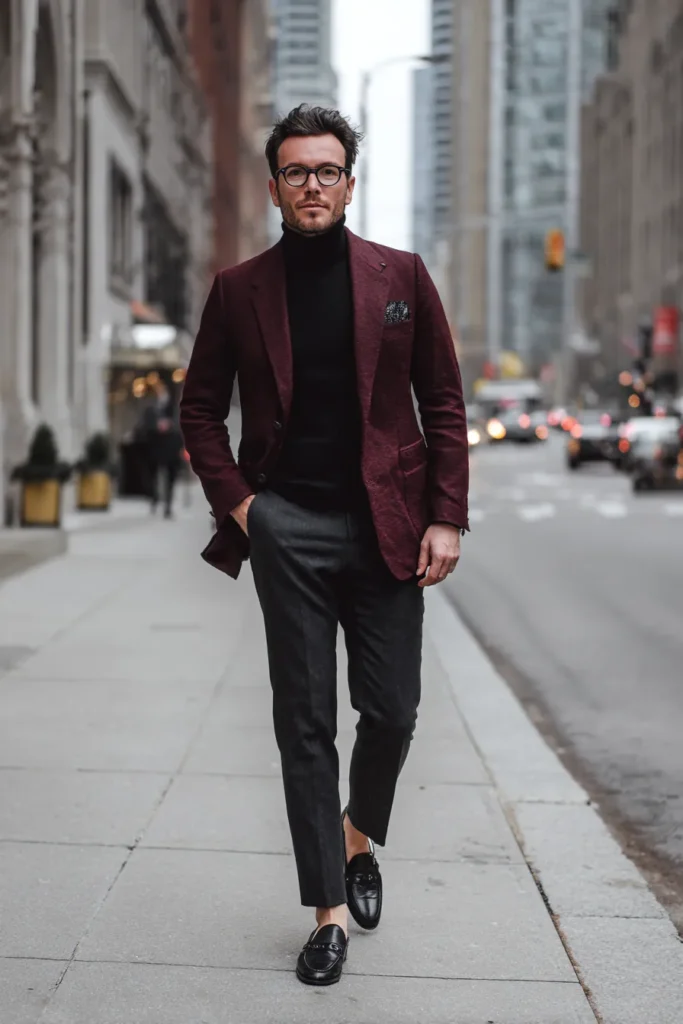 This look is pure city chic perfection! It features a rich, textured maroon blazer layered over a sleek black turtleneck, which is such a classic combination. The trousers are a sophisticated dark charcoal gray, providing a nice neutral base. He’s finished the outfit with black leather loafers that have a cool metallic detail, and you can spot a coordinating patterned pocket square adding a subtle touch of elegance to the blazer. The overall vibe is polished, smart, and totally ready for a stylish evening out or a sharp day in the city.