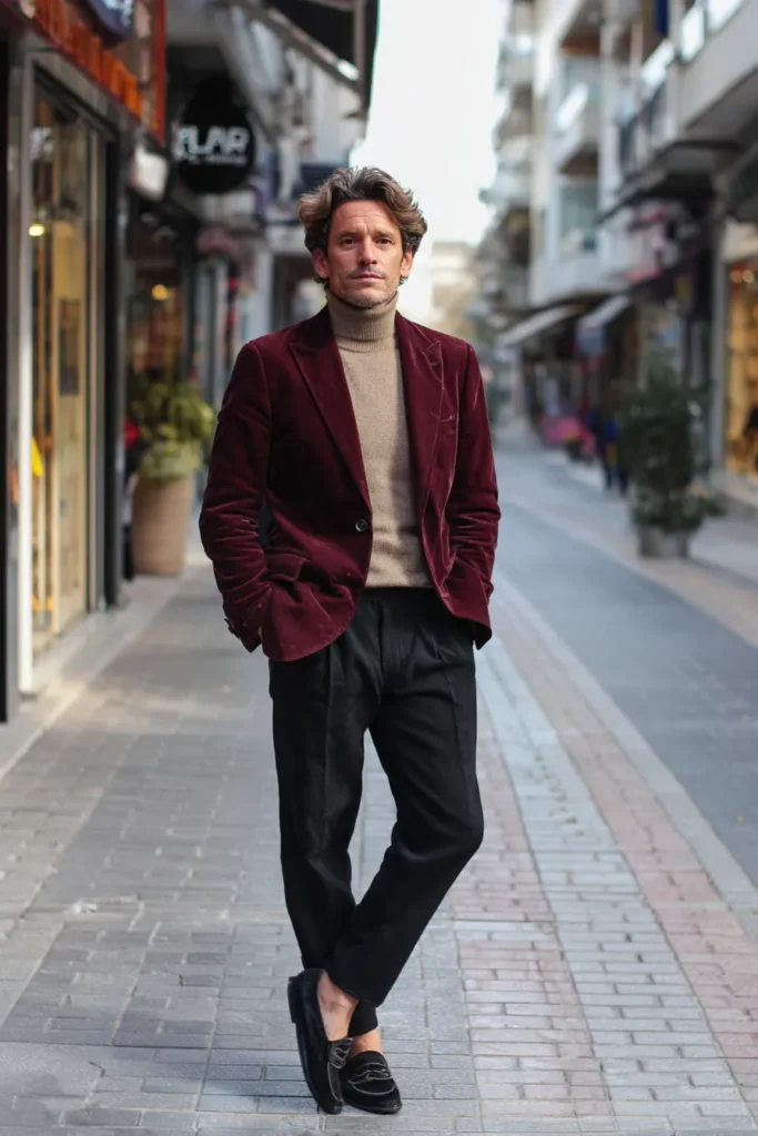 I absolutely adore this outfit because the mix of textures is just brilliant, especially that plush velvet maroon blazer. It feels so luxurious and festive without being over-the-top, and the color is simply divine! Pairing it with a lighter neutral turtleneck instead of a stark black one softens the entire look, making it feel more approachable and warm. Also, the choice of those flowing black trousers and the sleek loafers creates a modern, slightly relaxed silhouette that is super flattering and sophisticated. It’s a definite winner for high-end style!