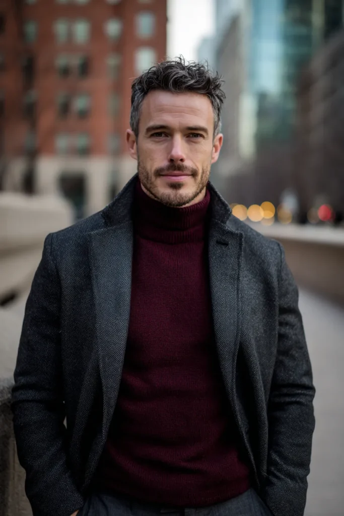 This outfit is the definition of cold-weather sophistication and handsome layering! He’s wearing a beautiful, rich maroon turtleneck sweater that instantly adds warmth and a pop of color close to his face. Layered over the sweater is a heavy, textured dark charcoal or black overcoat, which looks incredibly sharp and luxurious. The coat’s texture, possibly wool or tweed, provides a nice contrast to the smoothness of the sweater, making the overall look extremely polished. It’s a gorgeous ensemble for tackling a chilly day in the city with serious style.