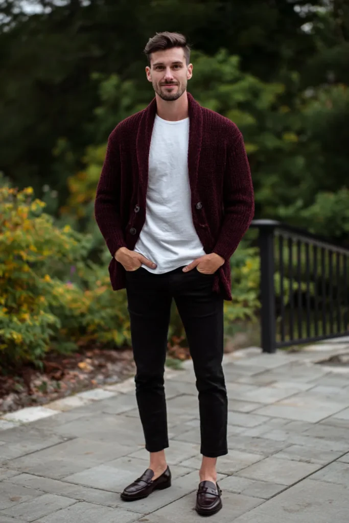 This outfit is the definition of casual elegance and comfortable style for a crisp day! He’s wearing a gorgeous, thick-knit maroon cardigan with a shawl collar, which is left open to show a simple white crew-neck tee underneath. The bottom half is kept super sleek with slim-fitting black trousers or black denim, creating a dark, clean line. He’s finished the look with sophisticated dark burgundy leather loafers that match the cardigan’s deep tone. It’s a chic and simple ensemble that looks totally put-together without feeling overly formal.