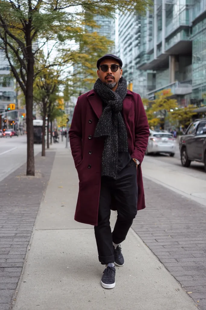 This look is pure power dressing for the city streets and it screams sophisticated confidence! The star of the show is definitely that gorgeous, long maroon overcoat, which adds a fantastic, bold color statement. He’s layered it over all-black pieces underneath, including black trousers that are casually cuffed, and possibly a black shirt or sweater. The essential accessory is the chunky, textured black-and-grey knit scarf, worn dramatically wrapped around the neck. A black flat cap, dark sunglasses, and sporty black sneakers finish this super cool, high-impact ensemble.