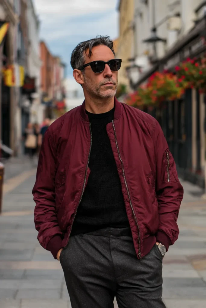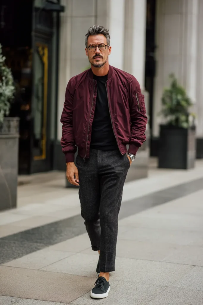 What I really love about this look is the exciting mix of casual and formal elements that just creates a truly flattering, modern aesthetic. The maroon bomber brings that bold, fashionable color, but the black shirt and the tailored gray trousers underneath keep everything super smart and mature. Those cropped trousers are key too, because they show off the ankle and keep the silhouette looking sharp and not bulky at all. It proves you can wear a slightly edgy jacket and still look totally refined and put-together for any daytime event.