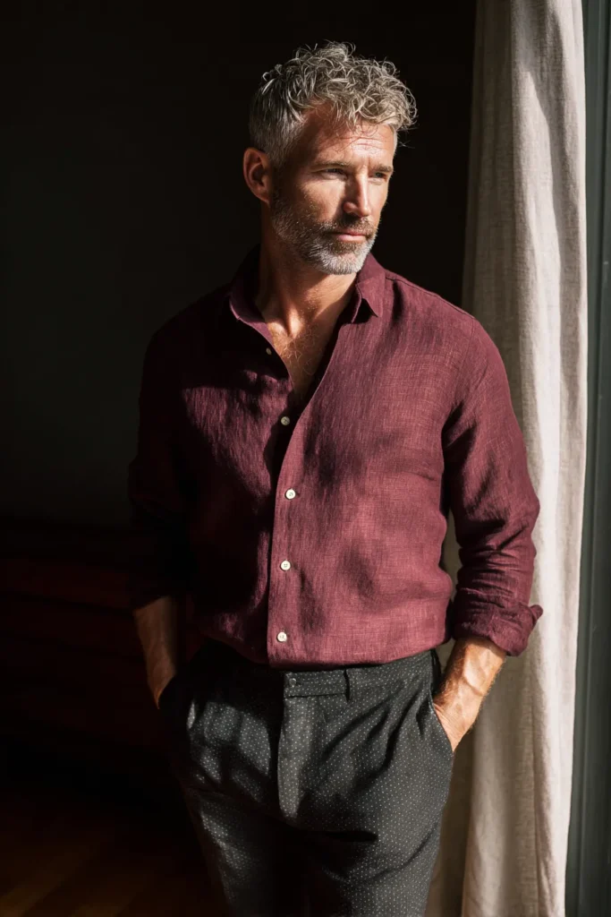This outfit is giving me major sophisticated vacation vibes, perfect for a warm evening or a breezy day! He’s wearing a beautiful, long-sleeved maroon linen shirt, which looks so breathable and comfortable. The shirt is slightly unbuttoned and the sleeves are rolled up, adding to that relaxed charm. It’s smartly tucked into dark gray trousers that feature a subtle pin-dot or micro-pattern texture, creating a fantastic contrast with the shirt’s solid color. The overall feeling is effortlessly stylish, mature, and comfortable all at once.