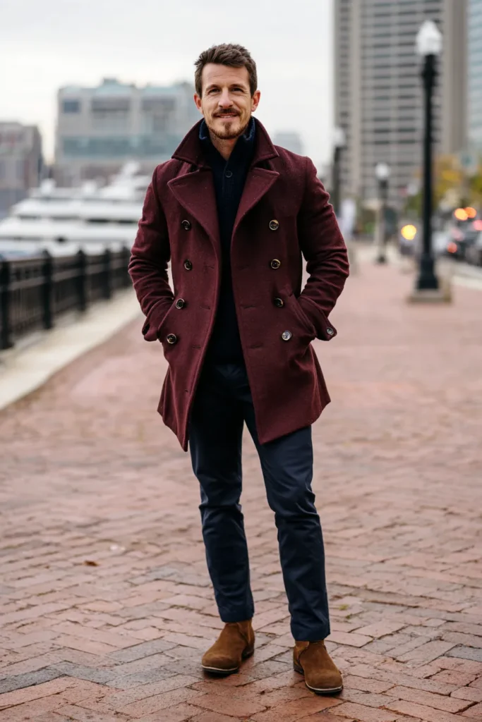 What a wonderfully warm and nautical-inspired cold-weather outfit! The statement piece here is a gorgeous, rich maroon double-breasted peacoat with dark buttons, which gives a fantastic pop of color and a classic military structure. He’s layered it over a dark navy blue knit sweater or collared shirt for warmth. The coat is paired with dark navy blue trousers that match the base layer beautifully. Finishing the look are warm brown suede chukka boots, giving this ensemble a grounded, handsome, and ready-for-the-waterfront vibe.