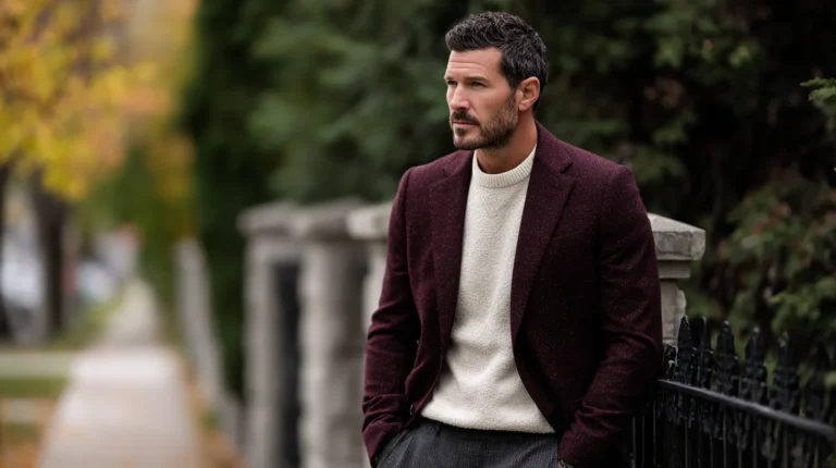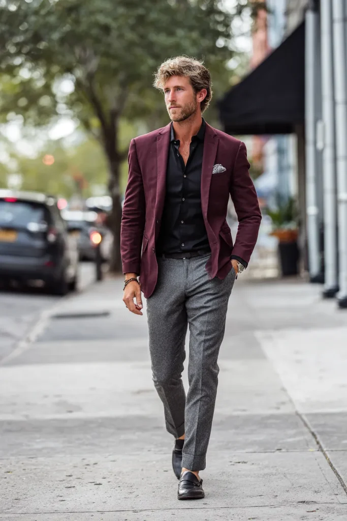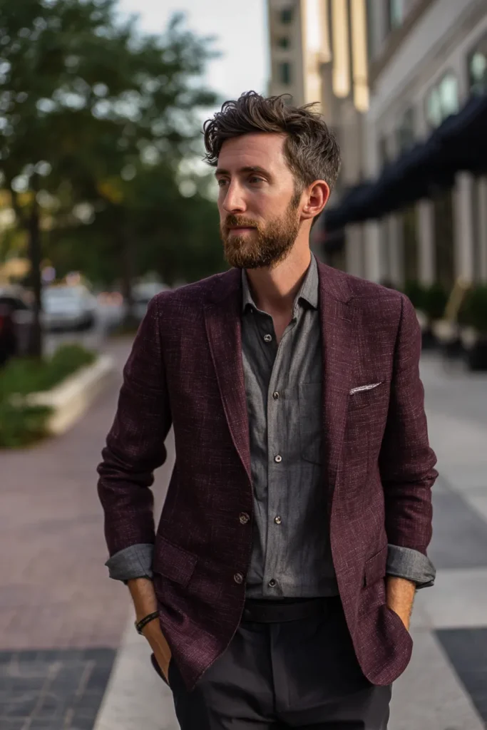 I think this ensemble works so well because it takes classic formal pieces and makes them feel fresh and approachable. The maroon blazer is the bold star, and instead of pairing it with white, using that muted gray shirt is such a clever way to keep the color palette sophisticated and unexpected. The rolled sleeves and slightly open collar on the shirt add a wonderful casual ease that stops the blazer from feeling stuffy. It’s truly a look that suggests great taste and an understanding that the best style is often relaxed, not rigid.