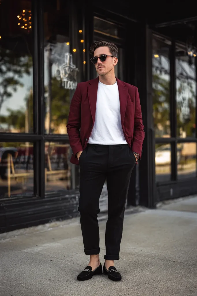 I am completely obsessed with this combination because it’s the perfect way to make a blazer feel relaxed and totally current. The maroon color is stunning, and pairing it with the super simple white tee is brilliant—it immediately takes the formality down a notch while still looking incredibly smart. Those cuffed black trousers are key because they keep the fit modern and show off those luxurious loafers. It proves that you can ditch the traditional shirt and tie and still look absolutely refined and put-together in a snap!