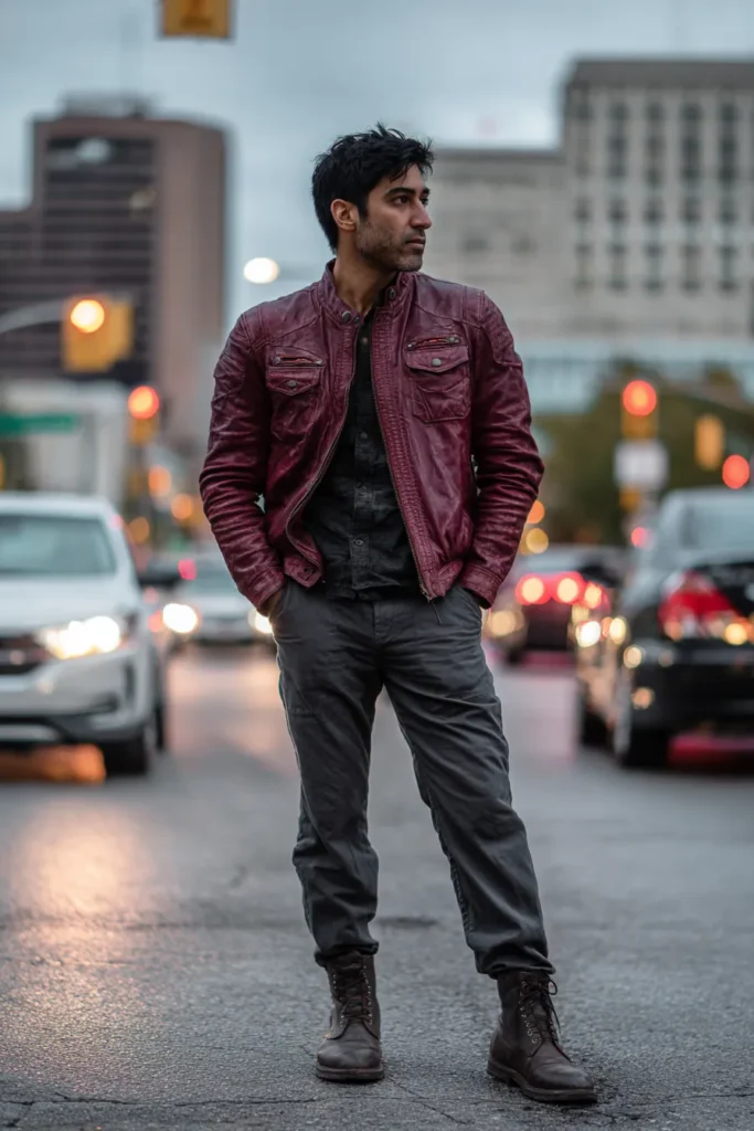 I really love how this outfit incorporates that bold maroon color in a tough, stylish way with the leather jacket. The slight texture and distress on the leather make the color feel grounded and less flashy, which is super chic. Pairing it with a muted color like dark gray for the rest of the outfit is smart because it lets the jacket take center stage. Also, the combination of a sharp jacket with slightly relaxed trousers and rugged boots is a brilliant high-low mix that looks effortlessly cool and totally flattering.