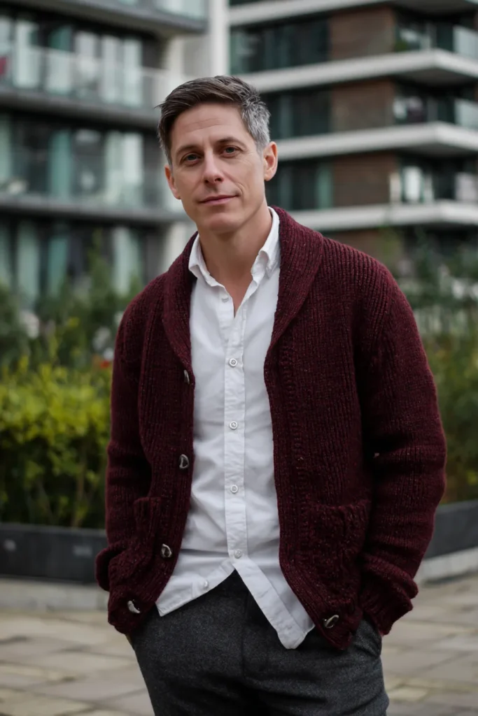 This is such a perfect look for combining comfort with classic smartness! He’s wearing a beautifully textured, chunky knit cardigan in a deep maroon shade, featuring a classic shawl collar and large buttons. This cozy layer is worn over a crisp white button-down shirt that is left open at the neck for a relaxed vibe. The bottom half is a pair of dark gray textured trousers, which provides a neutral and refined grounding point for the outfit. It’s a wonderful ensemble that feels warm, inviting, and effortlessly put-together for a casual day or an evening out.