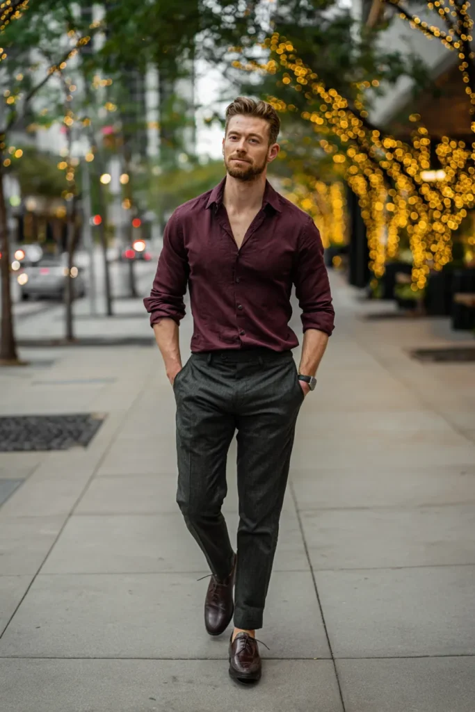 This outfit is the definition of clean, masculine, and ready for a sophisticated night out! He’s wearing a fitted, rich maroon dress shirt that looks incredibly luxurious with a subtle sheen, which is left unbuttoned casually at the collar and the sleeves are rolled up slightly. The shirt is perfectly paired with structured, dark charcoal gray wool trousers that look impeccably tailored. He’s finished the look with dark leather lace-up shoes and a sophisticated silver watch. The whole ensemble is sleek, confident, and very polished for a dinner date or cocktail hour.