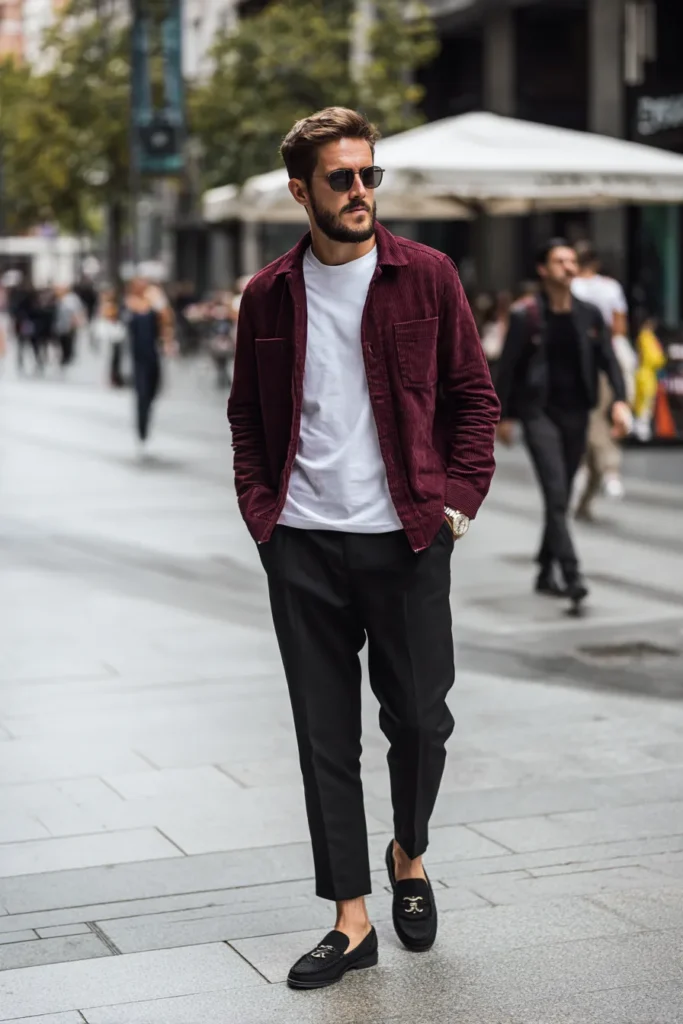 I think this whole ensemble works so beautifully because it’s a masterclass in balancing color and silhouette. The maroon corduroy adds a unique, rich texture that instantly elevates the basic white tee and black trousers. The trousers are key here because the cropped fit keeps the look modern and lightweight, preventing it from feeling too heavy or formal. Plus, those loafers are just gorgeous; they add a luxurious detail that screams high-end fashion, making this look chic without even trying too hard.