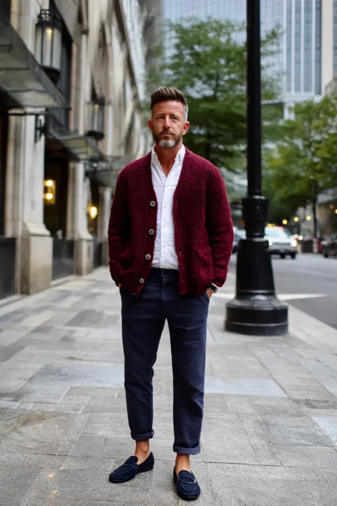 I think this outfit is a winner because it balances the softness of the cardigan with the sharpness of the other pieces. That rich maroon color in a textured, almost shaggy knit looks so elevated and interesting, and it pairs beautifully with the deep navy trousers. The little details, like the cuffed trousers showing off a bit of ankle and the contrasting white buttons on the shirt, prevent the look from feeling too heavy. It really is the ultimate proof that layering can be both comfortable and ridiculously chic all at once!