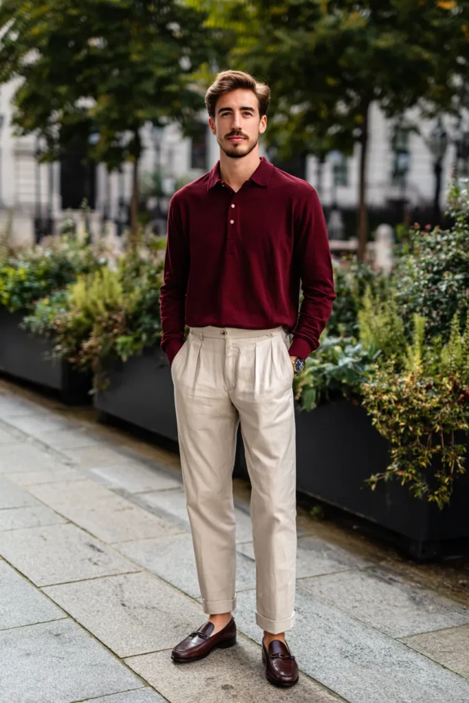 This outfit is the definition of quiet luxury and vintage coolness all rolled into one! He’s wearing a beautiful, long-sleeved maroon knit polo shirt, which looks like it’s made from a super soft cotton or silk blend. This top is tucked neatly into a pair of high-waisted, pleated trousers in a creamy off-white or light beige color, which are cuffed dramatically at the bottom. The look is grounded with dark burgundy leather loafers that perfectly match the shirt’s tone. It’s a clean, sophisticated, and wonderfully put-together look for warmer weather.