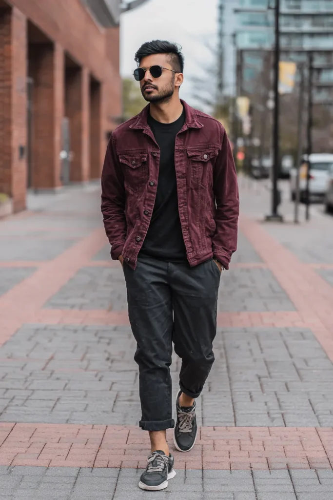 This look is a fantastic example of effortless cool-guy street style! He’s layered a cool, washed maroon denim jacket over a simple black crew-neck t-shirt. The bottoms are dark charcoal or black casual trousers that have a relaxed fit and are cuffed at the ankle for a deliberate, modern touch. He completes the outfit with comfortable gray-and-black athletic sneakers and a pair of classic round sunglasses. The whole vibe is relaxed, modern, and perfectly put-together for a stylish day out walking around the city.