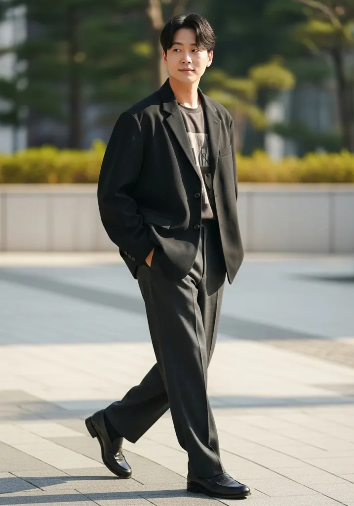This look features a slim black suit styled with a simple dark top underneath. The lines are clean and the fit is sharp without being tight. Black shoes keep everything cohesive and refined. The overall vibe feels modern and intentional.